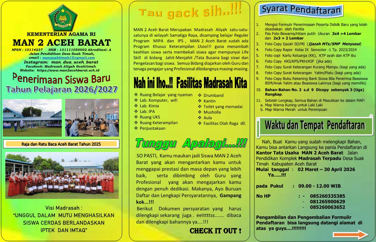 Saatnya kamu mengambil langkah terbaik untuk masa depanmu. Bergabunglah bersama MAN 2 Aceh Barat dan jadilah bagian dari generasi muda yang berprestasi, berkarakter, dan berlandaskan nilai-nilai keislaman. Pendaftaran Peserta Didik Baru telah dibuka—ayo daftarkan dirimu sekarang dan wujudkan cita-citamu bersama MAN 2 Aceh Barat!